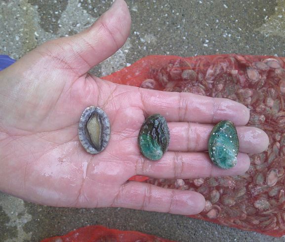 平均殻長 30mm(左2袋:赤アワビ、右1袋:黒アワビ)